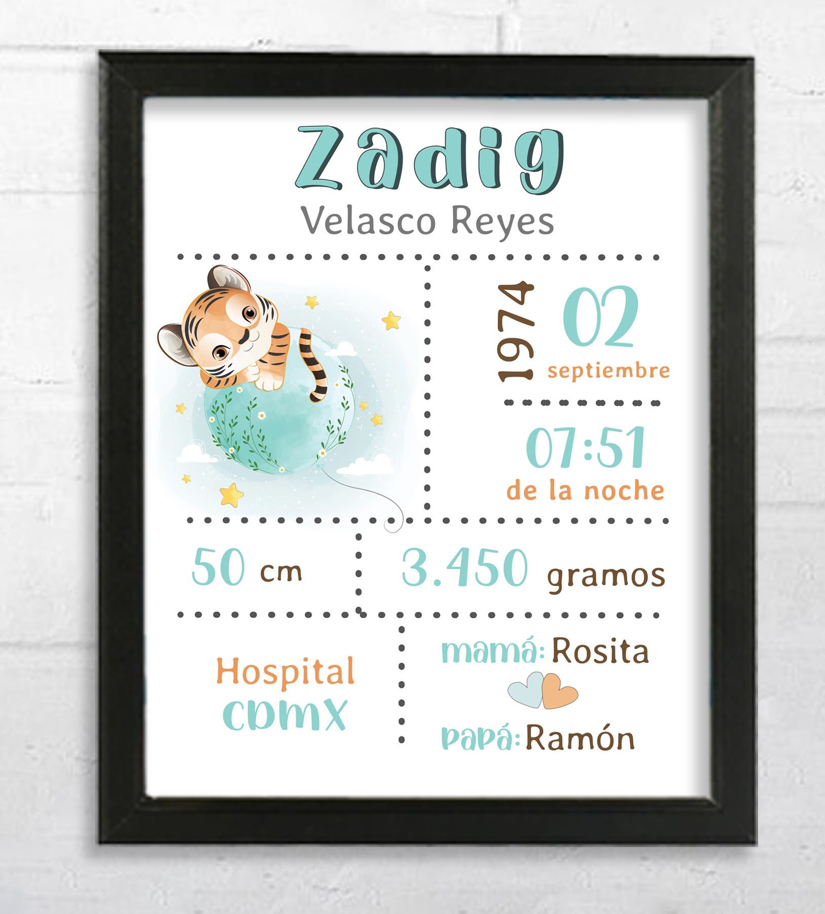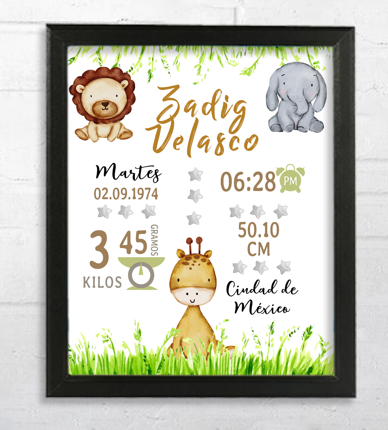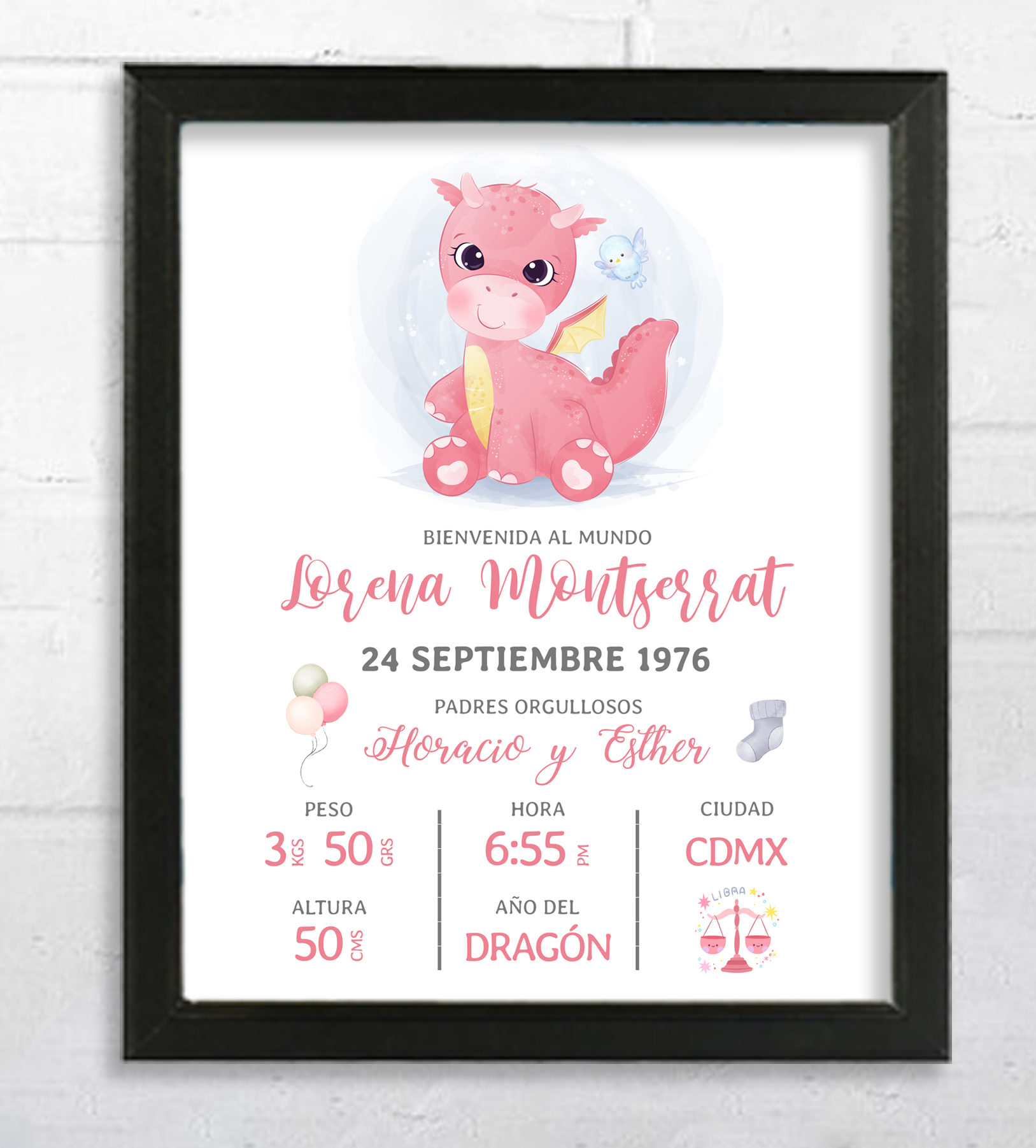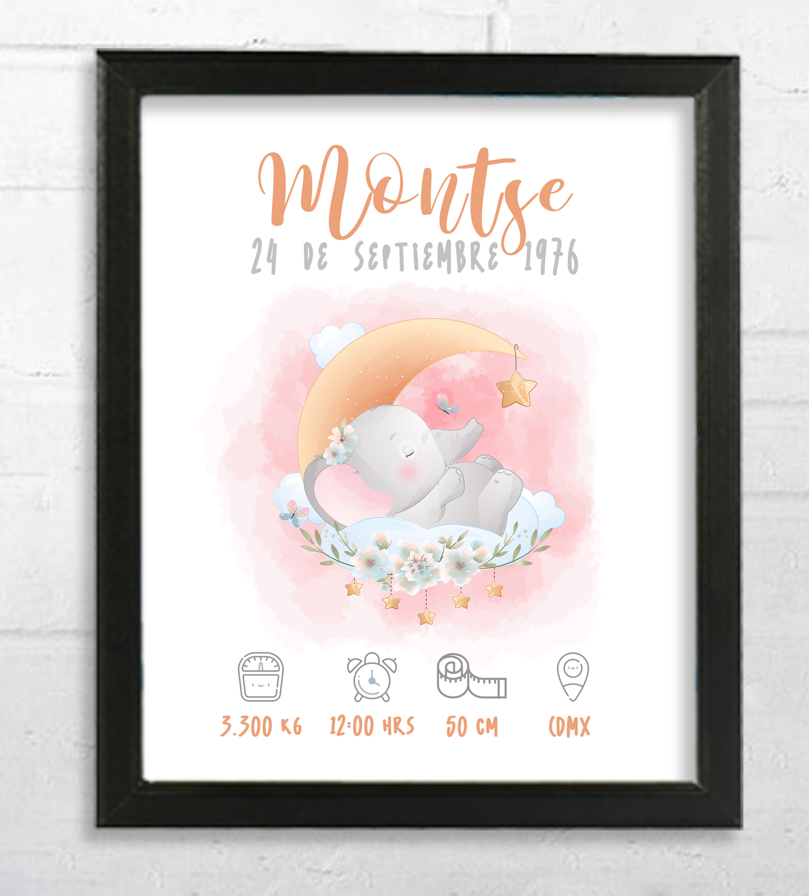 Nuestros portarretratos personalizados pueden incluir datos de nacimiento como la hora, peso y nombre del recién nacido.