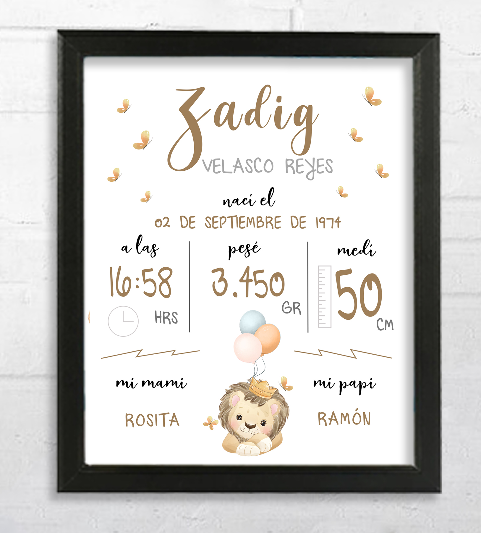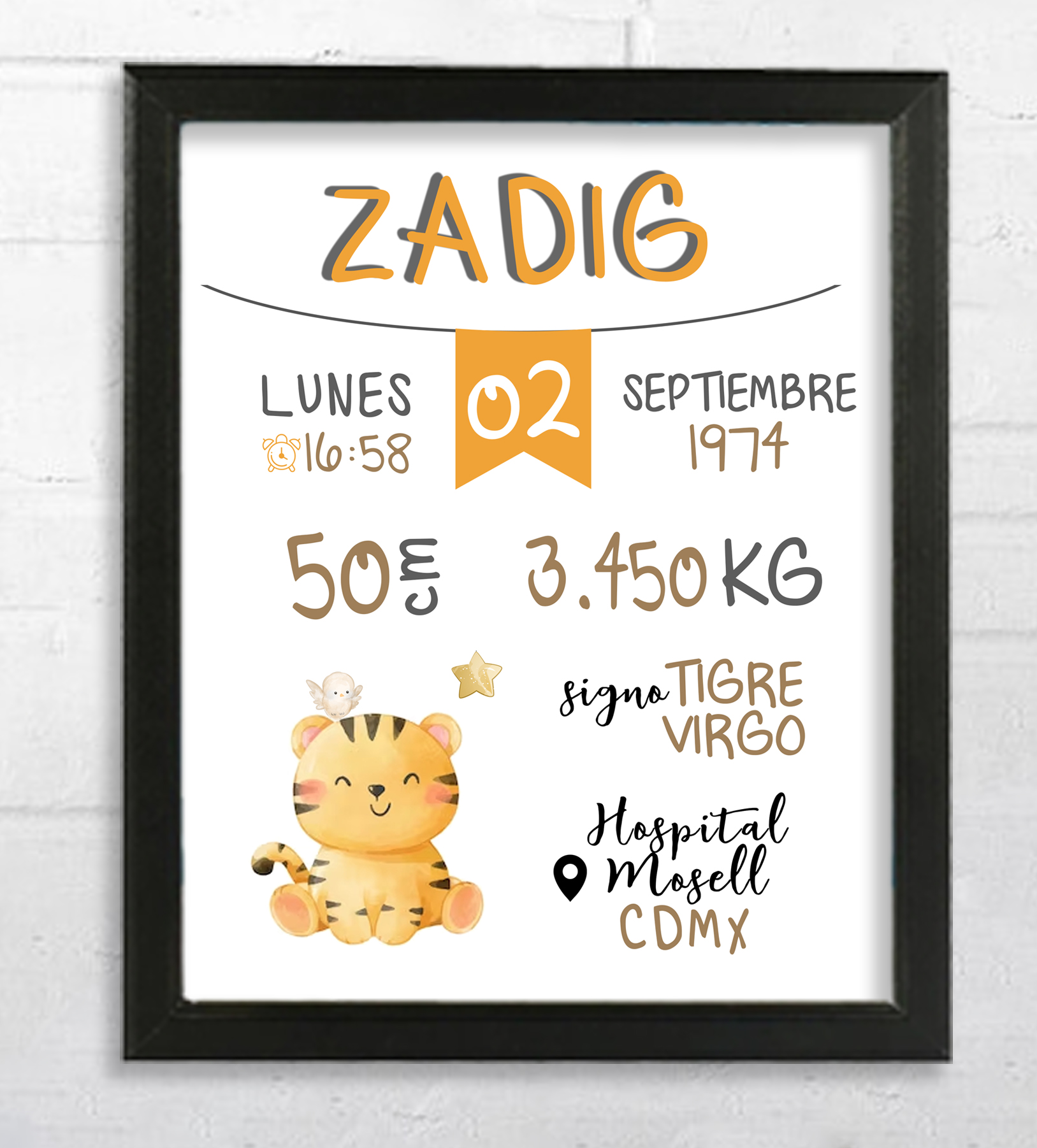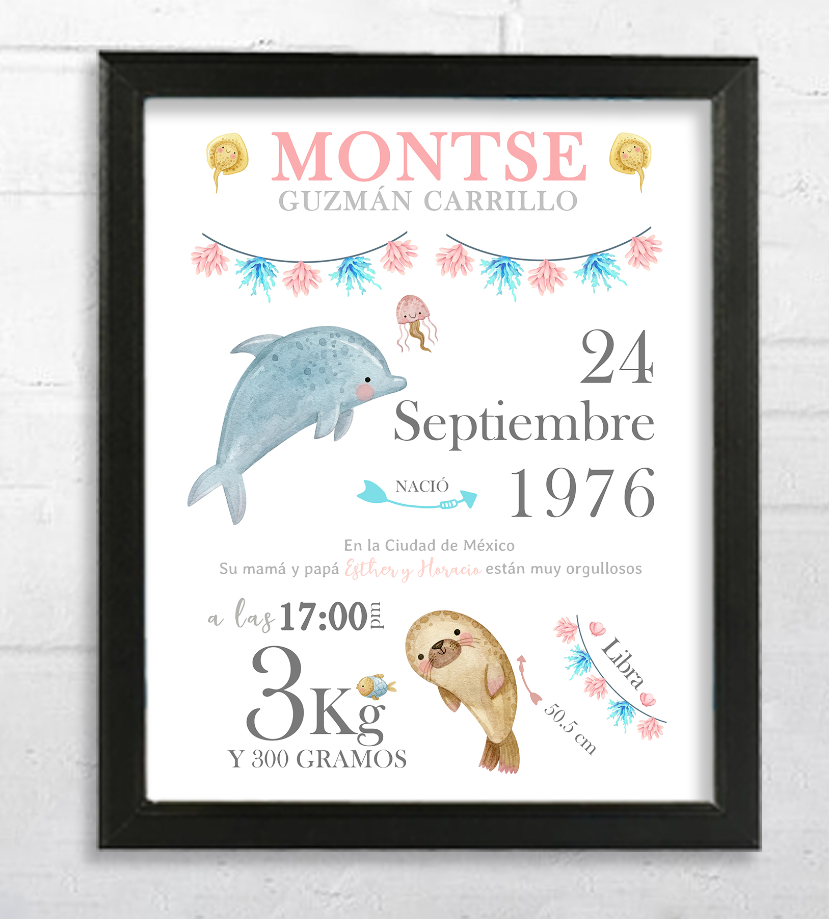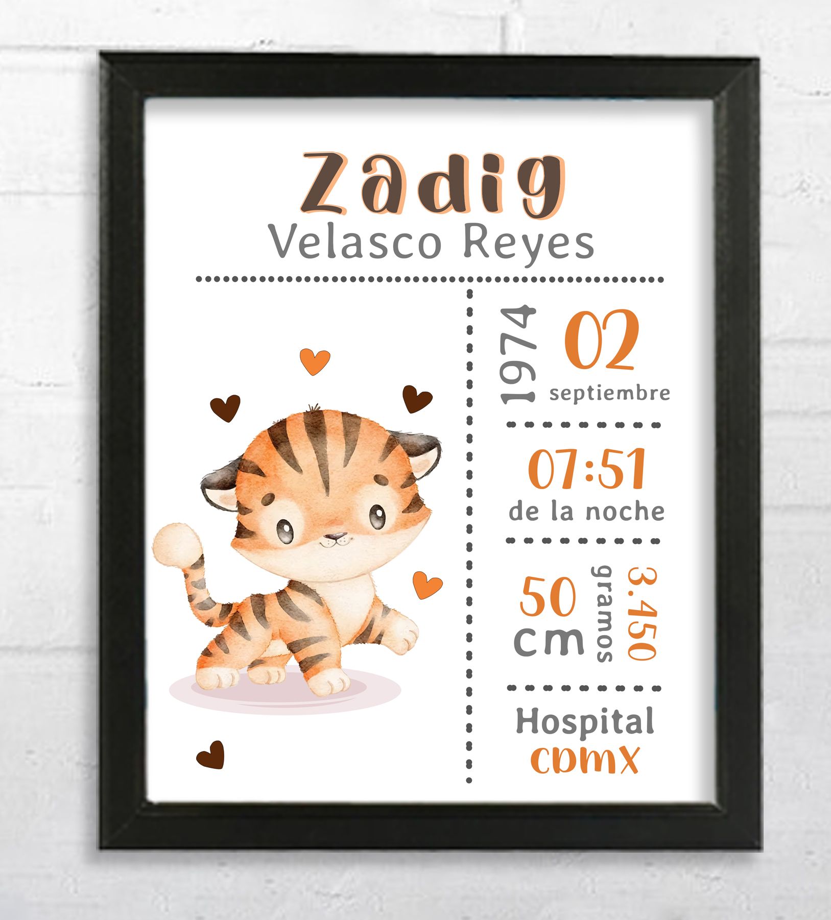Nuestros portarretratos personalizados pueden incluir datos de nacimiento como la hora, peso y nombre del recién nacido.